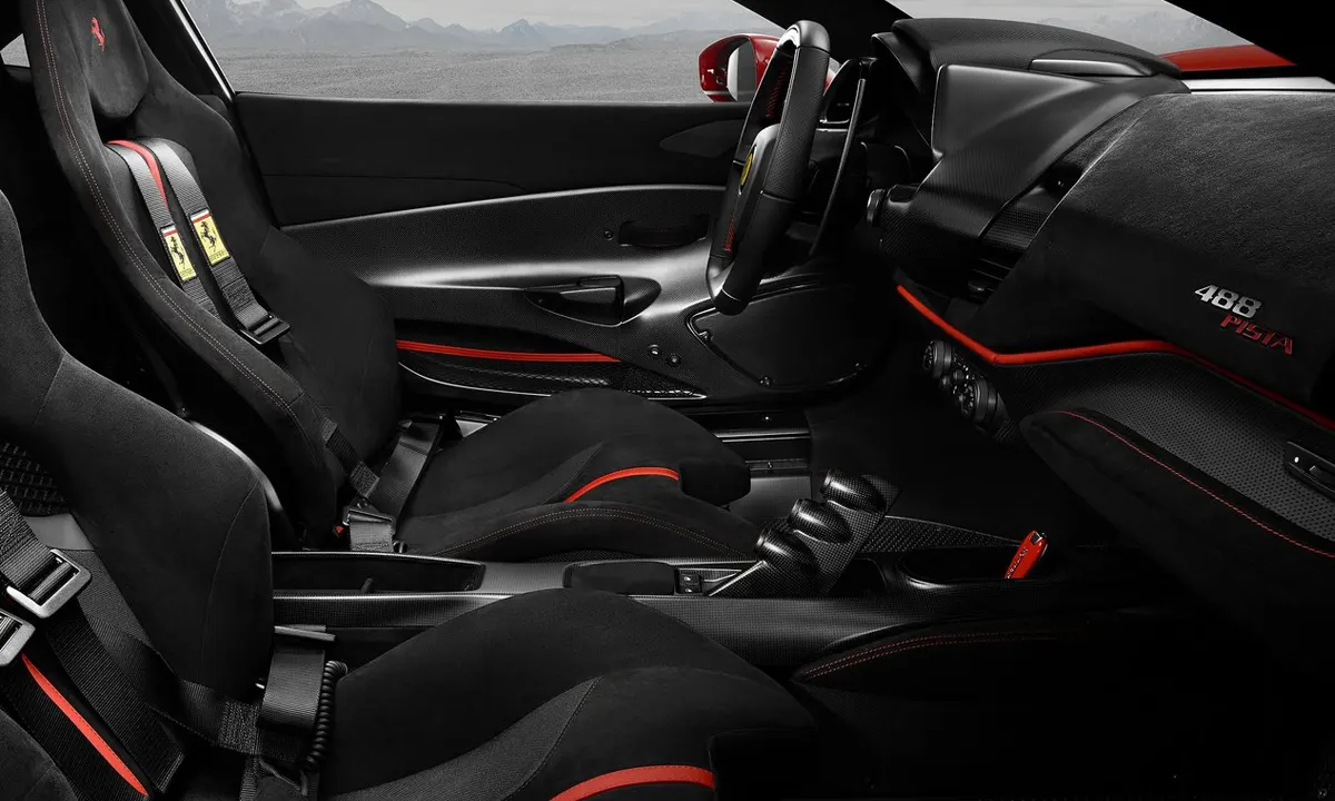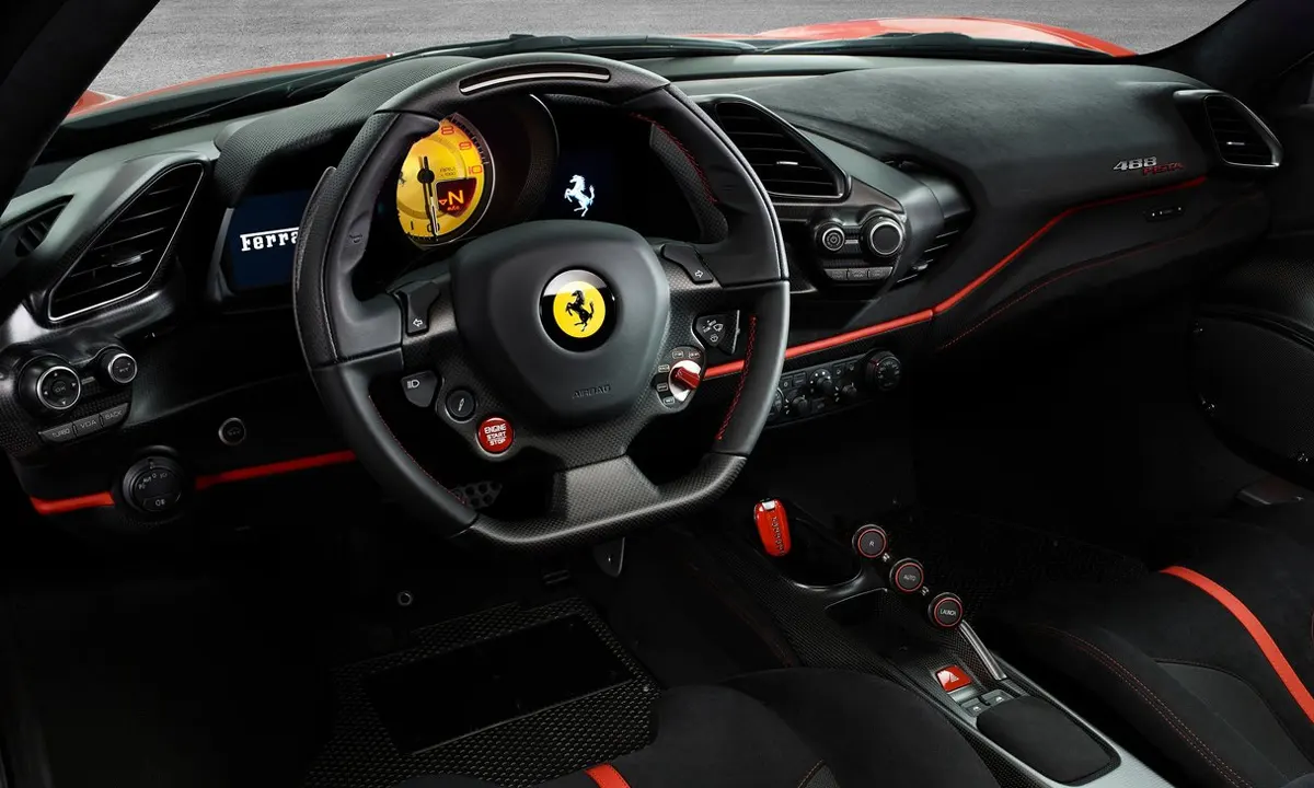 Standard carbon racing seats provide firm, well-shaped lateral support that holds the driver securely during the hard cornering the 488 Pista is engineered to deliver, while the optional Daytona carbon racing seats offer an alternative aesthetic character that references the Ferrari racing heritage more explicitly through their specific upholstery and stitching patterns. The steering wheel carries the full complement of Ferrari’s performance electronics controls — manettino mode selector, turn signals, wipers, drive mode adjustments and launch control activation — allowing the driver to manage every dynamic parameter without removing hands from the wheel. The flat-bottom profile and carbon fibre shift paddles provide a tactile quality that complements the mechanical directness of the driving experience they help facilitate.