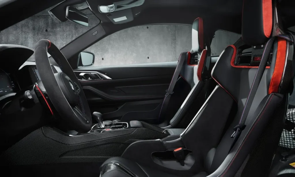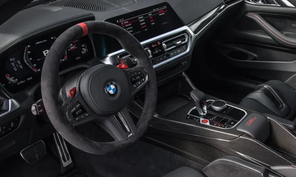 Red seat belts, embroidered CSL branding and lightweight door panels differentiate the interior from the standard M4. Although stripped down, the cabin does not feel unfinished; rather, it embraces the purposeful nature of sports-oriented vehicles.