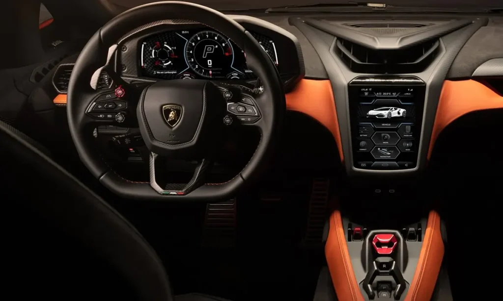 The cabin architecture emphasizes a fighter-jet aesthetic with sharp angles, bold lines and precision-milled controls. The steering wheel integrates drive-mode selectors, dynamic controls and interactive features that enhance the driver’s sense of command. Traditional Lamborghini start procedures remain intact, complete with the iconic red flip-cover ignition switch.