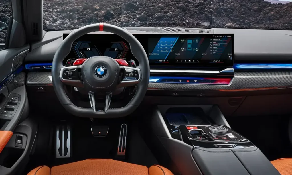 Dominating the dashboard is BMW’s Curved Display, a sweeping panel that integrates a 12.3-inch digital instrument cluster and a 14.9-inch infotainment touchscreen. It runs BMW’s latest iDrive 8.5 system, complete with M-specific menus, hybrid power displays, and real-time performance data.