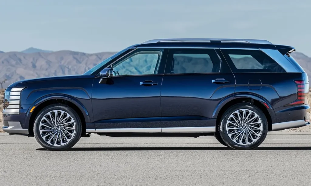 From the side profile, the SUV’s tall stature and long wheelbase add to its commanding presence, while chrome accents and premium wheel designs elevate its luxury-oriented personality. Hyundai successfully blends modern sophistication with rugged sturdiness — a combination that resonates strongly with family buyers and adventure enthusiasts alike.