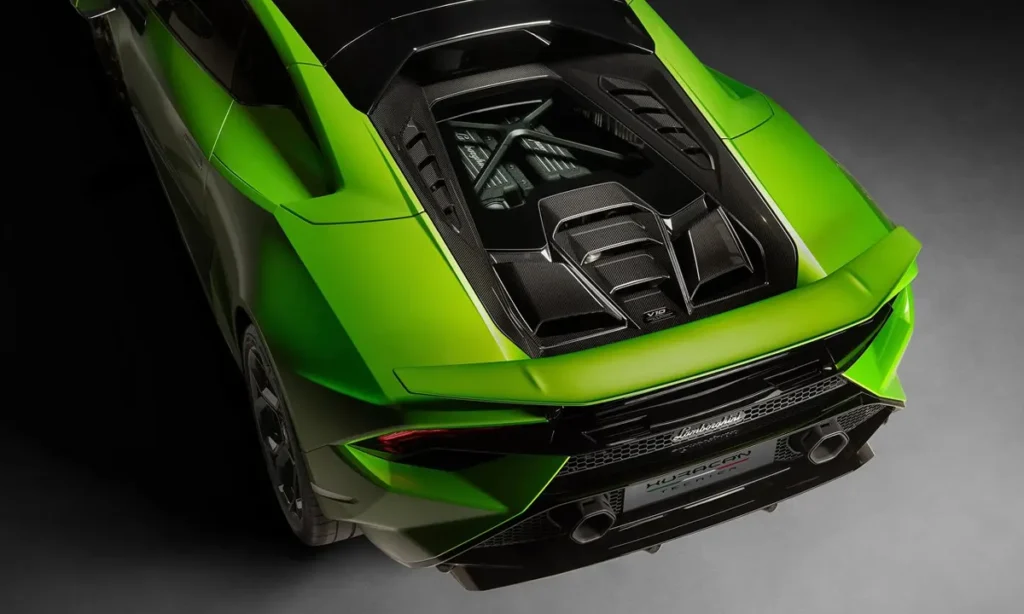 At the heart of the Lamborghini Huracán Tecnica lies one of the last naturally aspirated high-performance engines available on the global market. The 5.2-litre V10 produces 631 horsepower (640 CV) and 565 Nm of torque, delivering a deeply immersive driving experience that turbocharged engines cannot replicate. Lamborghini has consistently championed high-revving, naturally aspirated powerplants, and the Tecnica is perhaps the finest contemporary expression of this philosophy. The engine delivers linear acceleration, razor-sharp throttle response and an acoustic profile that defines the emotional engagement of the brand.