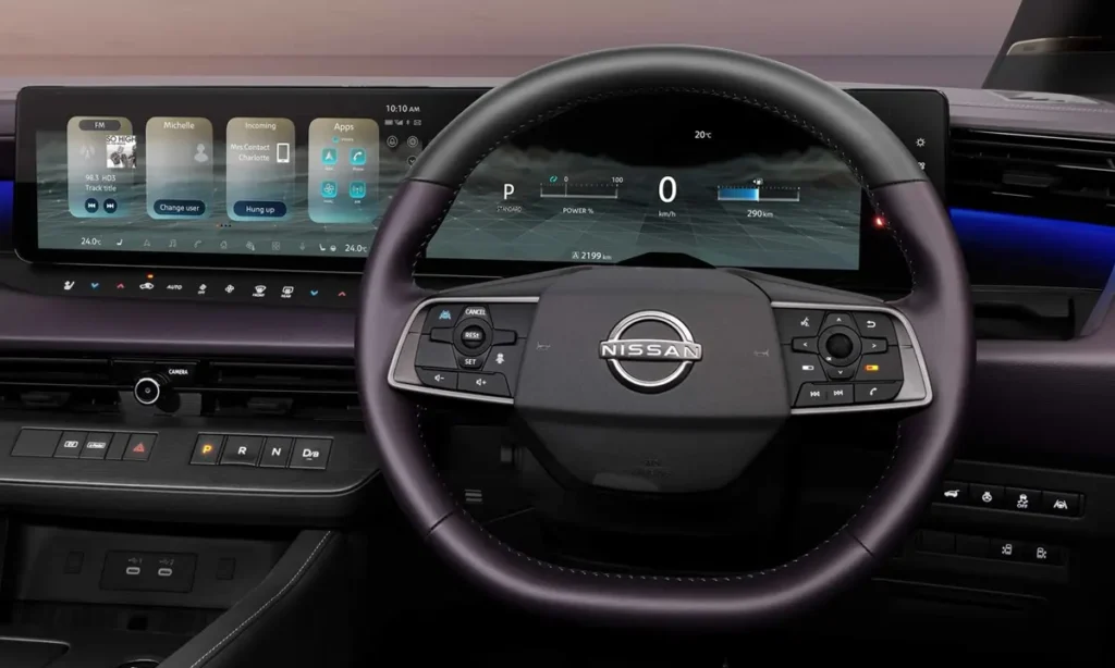 The dashboard features a floating dual-screen setup, similar to the Ariya EV — one for the digital instrument cluster and another for the infotainment system. Touch-sensitive panels and integrated ambient lighting replace traditional buttons, maintaining a clean, futuristic look.