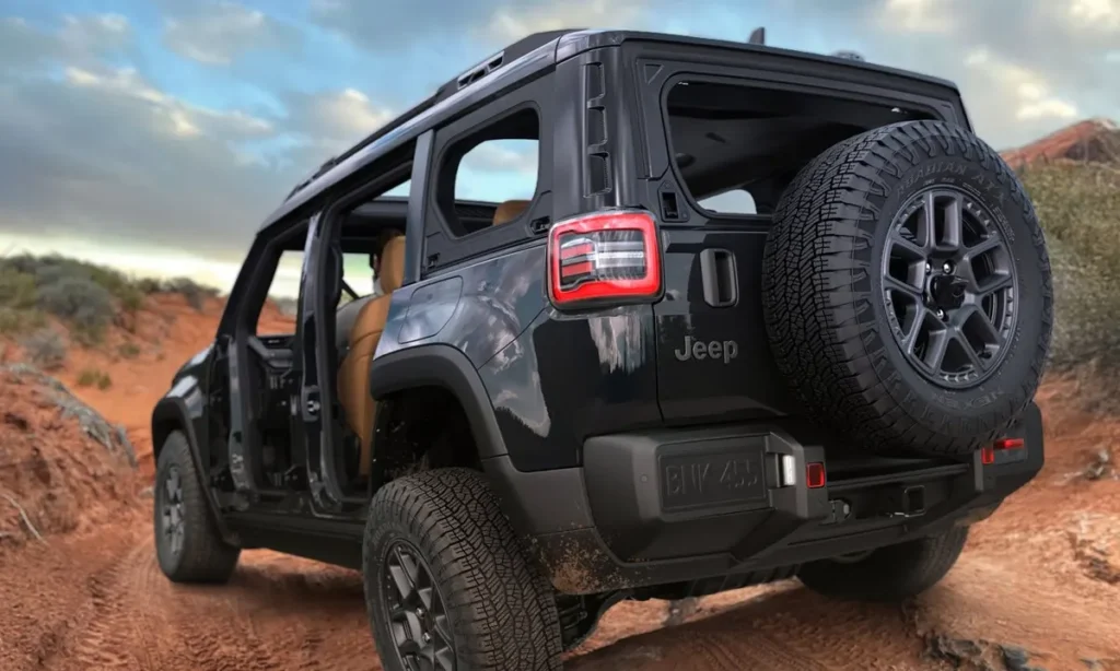 Along the sides, the Recon maintains Jeep’s iconic open-air ethos with removable doors and a removable roof. These elements preserve the adventurous lifestyle that Wrangler owners love, allowing passengers to fully immerse in nature. The wide stance, large wheel arches and all-terrain EV-specific tires reinforce the vehicle’s rugged purpose.
