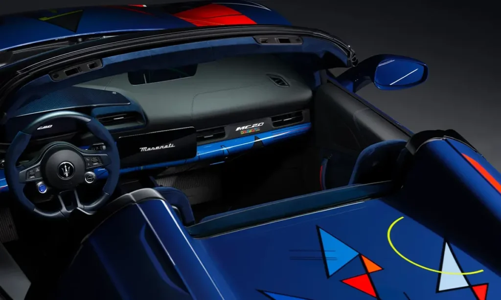 Inside the 2026 Maserati MC20 Cielo Opera d’Arte, Maserati’s Trident Design Studio created an environment intended to resemble a luxury art gallery fused with a racing cockpit. The interior uses a curated blend of materials exclusive to the Opera d’Arte model—including Alcantara panels hand-embroidered with abstract Italian motifs, polished carbon fiber dyed in bespoke hues and full-grain leather sourced from master tanneries in Modena.