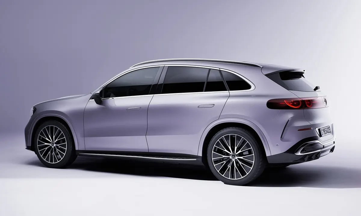 The profile of the GLC EV is significantly smoother and more aerodynamically resolved than the combustion model it sits alongside in the Mercedes-Benz lineup. Flush door handles are standard, body panel transitions are tightly controlled and the overall silhouette achieves a drag coefficient that contributes meaningfully to the car’s range performance. The MB.EA platform’s longer wheelbase — extending approximately 50 millimetres beyond the equivalent combustion GLC despite the two vehicles measuring essentially the same overall length — is visually expressed through a slightly longer and more graceful glasshouse that gives the GLC EV a more elegant proportion than its immediate exterior dimensions might suggest. At the rear, elongated horizontal taillights wrap around the body with a three-dimensional sculptural quality, housing an integrated light bar that creates a strong and recognisable signature in the rearview mirrors of following traffic. The optional AMG Line styling package adds sportier bumper treatments, more prominent side sill extensions and 21-inch AMG alloy wheels that give the GLC EV a more assertive and more performance-oriented road presence.