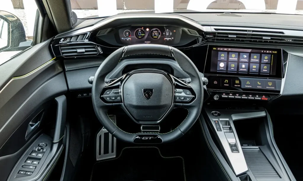 Inside the 2026 Peugeot 308 SW, the cabin showcases Peugeot’s i-Cockpit philosophy, emphasizing a futuristic, driver-centric layout. The standout features include a compact steering wheel, a fully digital 3D instrument cluster and a large central touchscreen with intuitive menu navigation.