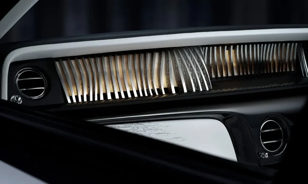 Rolls-Royce’s renowned wood veneer craftsmanship reaches new heights in this edition. The door panels and dashboard feature 3D marquetry and gold-leaf detailing, depicting symbolic maps and significant journeys taken by early Phantom owners. The intricate layering and inking techniques showcase a fusion of traditional craftsmanship with cutting-edge artistry.