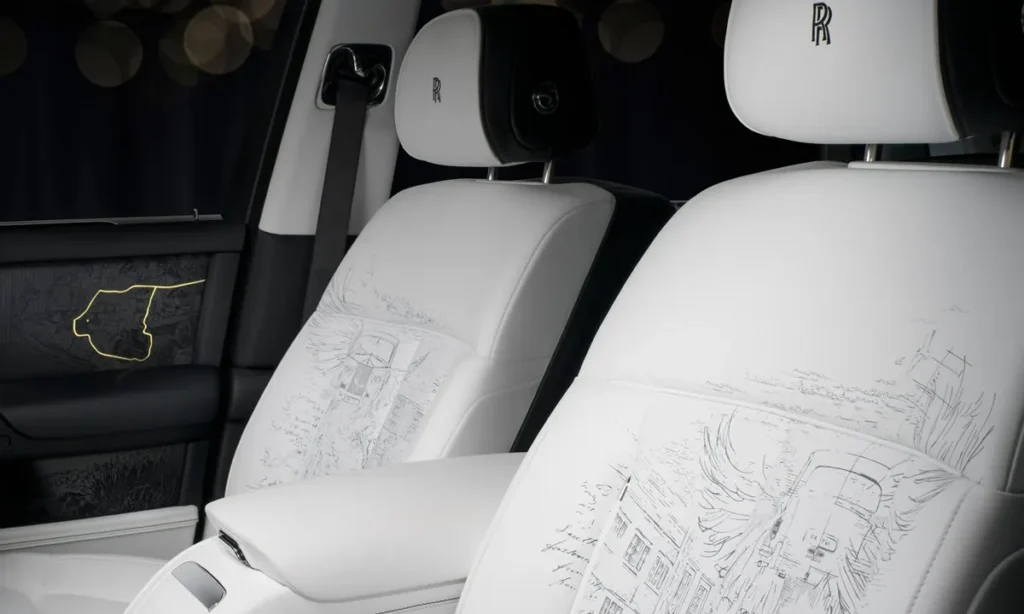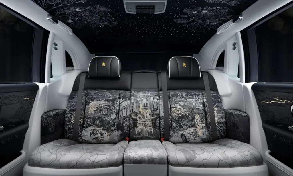The rear seats are the heart of the Centenary story. Inspired by the 1926 “Phantom of Love,” these seats feature intricate embroidery with over 160,000 stitches, illustrating the model’s evolution over a century. Layers of fabric and thread depict key historical Phantom models and their distinguished owners, turning each seat into a living chronicle of the brand.