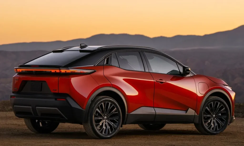 From the side, the C-HR BEV maintains its coupe-inspired crossover silhouette. The sloping roofline gives the vehicle a dynamic profile, while the pronounced wheel arches emphasize its sporty stance. Flush door handles further enhance aerodynamic efficiency while contributing to the vehicle’s clean design.