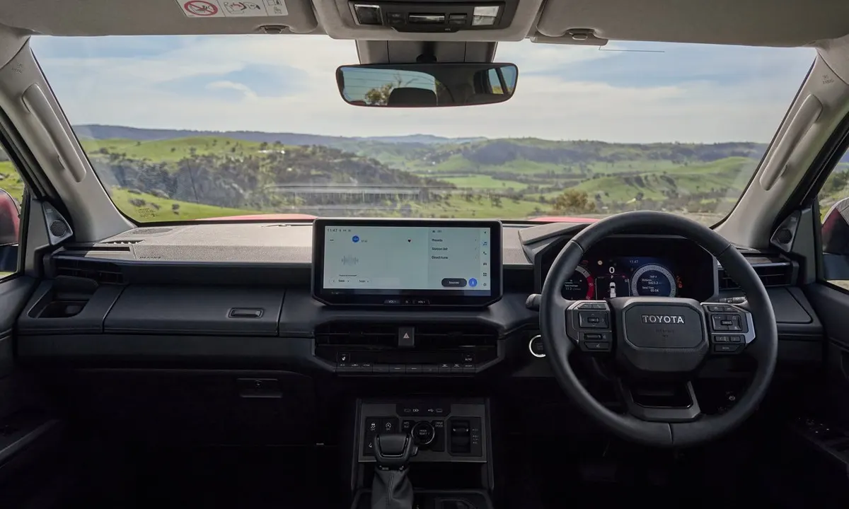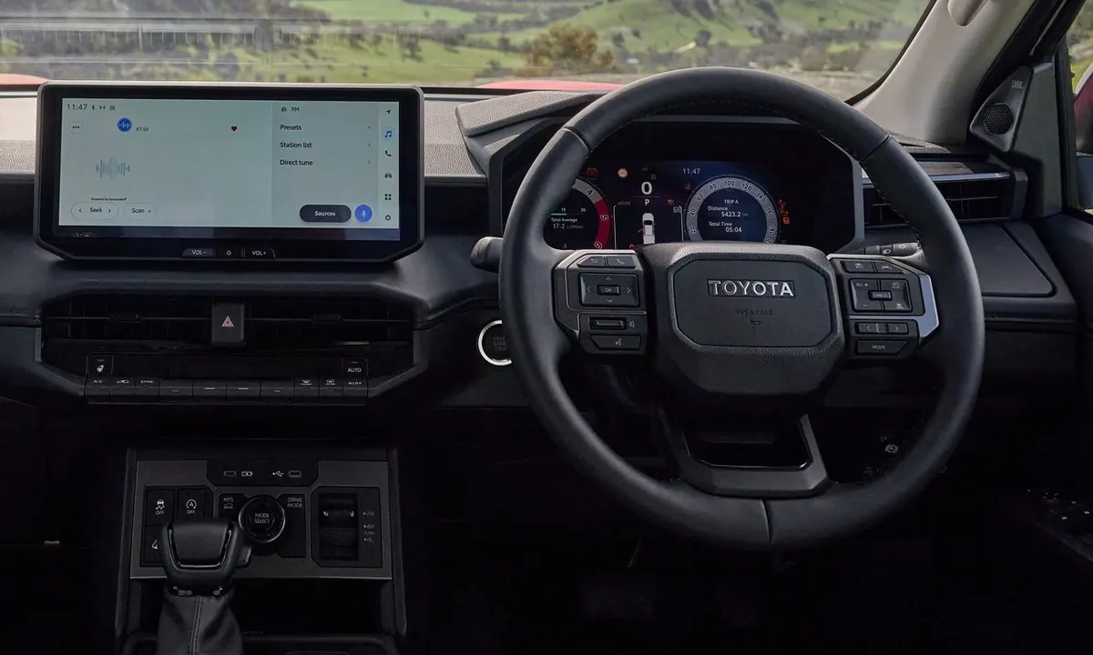 The ninth-generation Hilux’s most significant departure from its immediate predecessors is the depth of the interior and technology improvements that Toyota has delivered without diluting the working vehicle capability that defines the model’s identity. The cabin that What Car described as vastly improved over previous generations now features a 12.3-inch central touchscreen with wireless Apple CarPlay and Android Auto integration, a fully digital instrument cluster, wireless device charging, front and rear USB-C ports and a 360-degree camera system on select trims that provides the comprehensive situational awareness around the vehicle’s substantial dimensions that makes parking and low-speed manoeuvring significantly more manageable in urban and construction site environments. Sound deadening has been substantially improved — the 2026 Hilux’s highway refinement is meaningfully better than the generation it replaces, and the cabin’s ability to insulate its occupants from road and wind noise on longer journeys has transformed from a practical weakness into a genuine competitive attribute.