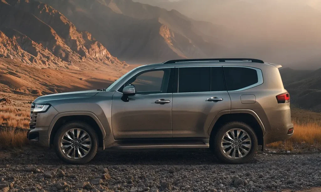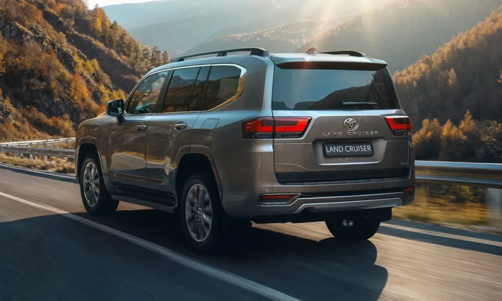 Along the sides, the Land Cruiser maintains its traditional boxy silhouette, which is essential for maximizing interior space and off-road capability. Strong character lines run along the body, emphasizing the SUV’s muscular structure and reinforcing its rugged personality. Large wheel arches accommodate heavy-duty off-road tires mounted on durable alloy wheels.