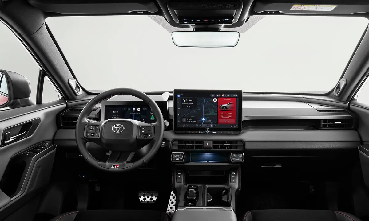 The GR Sport steering wheel — with its flat-bottom design, leather wrap with red stitching accent and GR badge at the six o’clock position — provides the driver interface whose visual and tactile character matches the GR Sport’s dynamic ambition more completely than the standard RAV4’s steering wheel achieves. The aluminium sport pedals, the GR Sport-specific instrument cluster with its performance data display mode and the ambient lighting scheme whose red accent option echoes the exterior and interior stitching colour complete the interior package’s coherent special specification identity.