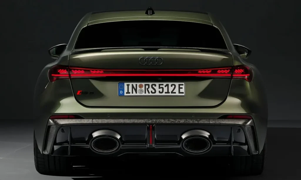At the rear, the RS5 Sedan features a redesigned bumper with an integrated diffuser that improves aerodynamic performance. Dual oval exhaust outlets, a signature feature of Audi RS models, emphasize the car’s high-performance identity. Slim LED taillights connected by a light bar create a modern and distinctive rear appearance.