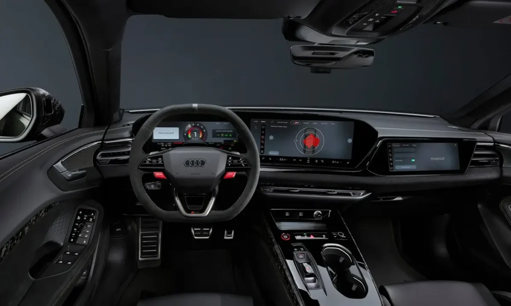 The dashboard features Audi’s latest digital cockpit system, which integrates a fully digital instrument cluster with a large central infotainment display. These screens provide customizable information such as navigation data, performance metrics, and media controls.