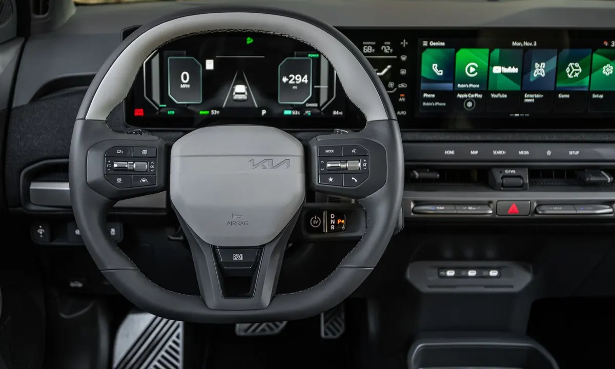 The interior design reflects Kia’s current generation aesthetic — the panoramic curved display assembly combining a 12.3-inch digital instrument cluster with a 12.3-inch central infotainment screen in a single sweeping visual unit, the sustainable material choices that Kia’s environmental positioning motivates across the EV3’s seat fabrics and interior trim surfaces, and the physical control retention for climate and audio functions that the brand’s owner feedback data identifies as a consistent preference among buyers who find fully touchscreen-dependent interfaces less satisfying in daily use than mixed physical and digital control environments.