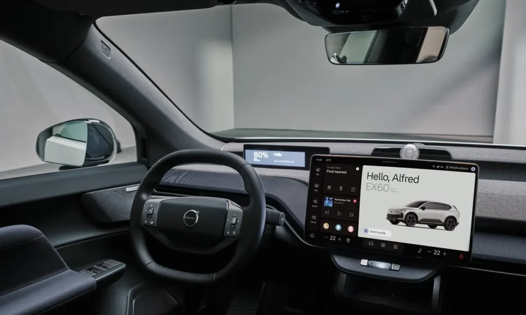 The dashboard features a large vertically oriented touchscreen powered by Google Android Automotive OS. This system integrates Google Maps navigation, voice assistant capabilities, and access to various digital services. Drivers can easily control vehicle functions, climate settings, and entertainment options through the intuitive interface.