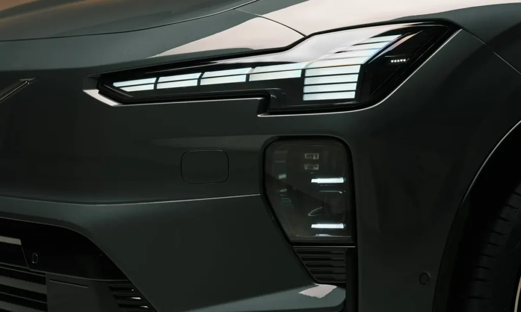 Volvo’s iconic “Thor’s Hammer” LED headlights remain a key design feature of the EX60. These headlights extend toward the sides of the vehicle, creating a distinctive lighting signature that has become synonymous with Volvo’s modern vehicles. The lighting system incorporates advanced adaptive technology that adjusts brightness and beam patterns depending on driving conditions.
