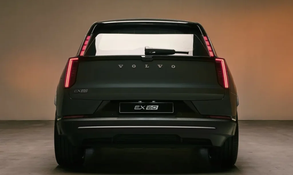At the rear, the EX60 features Volvo’s signature vertical LED taillights that extend along the edges of the tailgate. These lights are connected by a subtle horizontal light bar, creating a distinctive rear lighting signature that enhances visibility at night.
