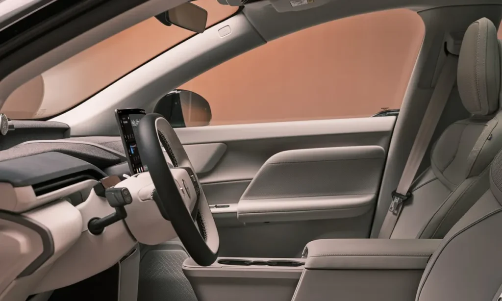 The dashboard features a vertically oriented touchscreen display powered by Google’s Android Automotive operating system. This system integrates Google Maps navigation, voice assistant functionality, and access to a wide range of digital services.