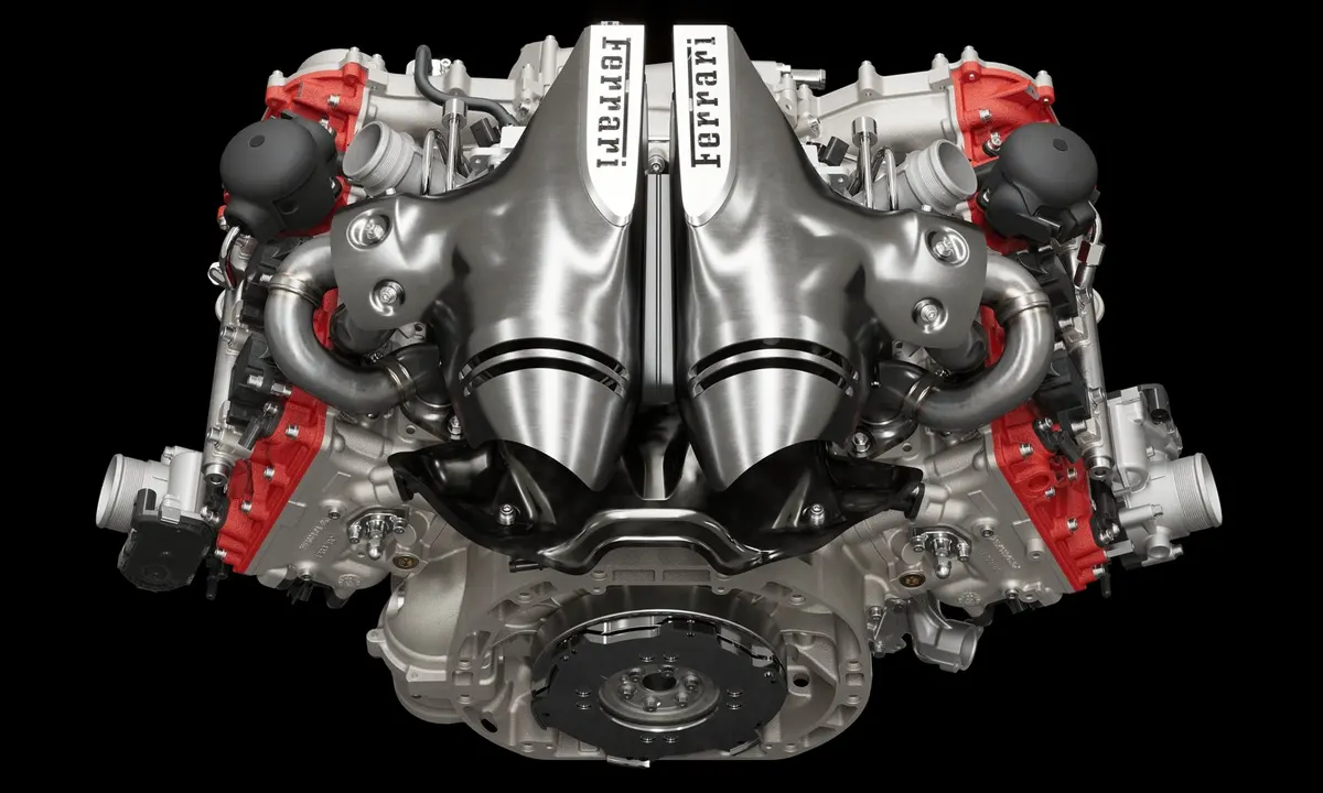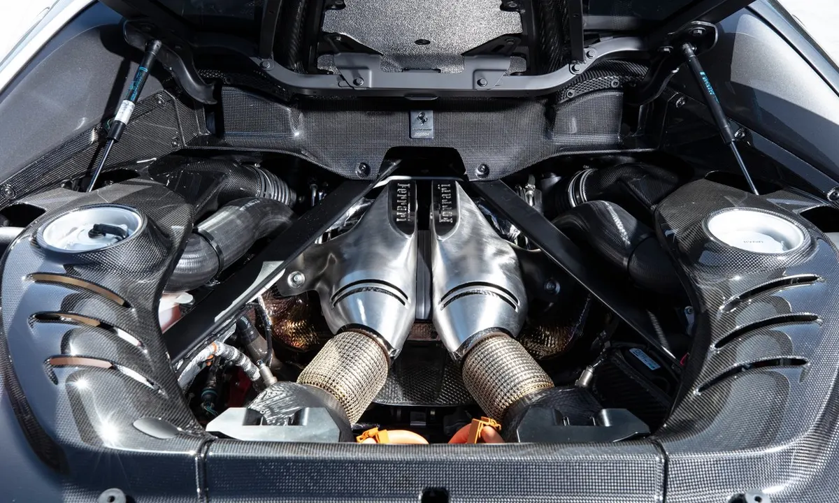 The engine at the heart of the Ferrari 296 GTB is one of the most significant new powerplants Ferrari has developed in decades, and its achievements deserve the recognition that the automotive press has enthusiastically extended since the car’s introduction. The F163 BC is a 2,992cc twin-turbocharged V6 with a 120-degree bank angle — an unusual configuration chosen specifically to enable the turbochargers to be positioned in the hot vee between the cylinder banks, a packaging solution derived directly from Ferrari’s Formula 1 technology that dramatically reduces turbo lag and concentrates the engine’s mass low and centrally within the car’s aluminium chassis. On its own, without electric assistance, this engine produces 654 horsepower at 8,000 rpm and 546 pound-feet of torque — figures that would have been extraordinary from a naturally aspirated V12 just fifteen years ago, delivered here from a unit less than three litres in displacement.