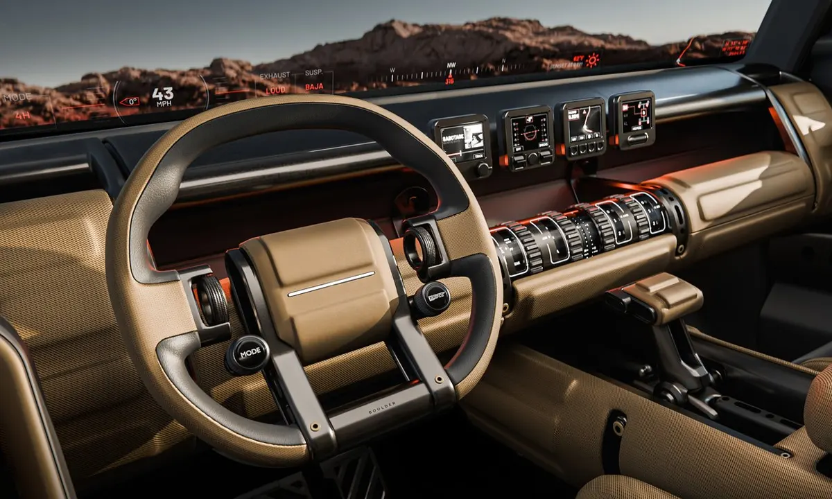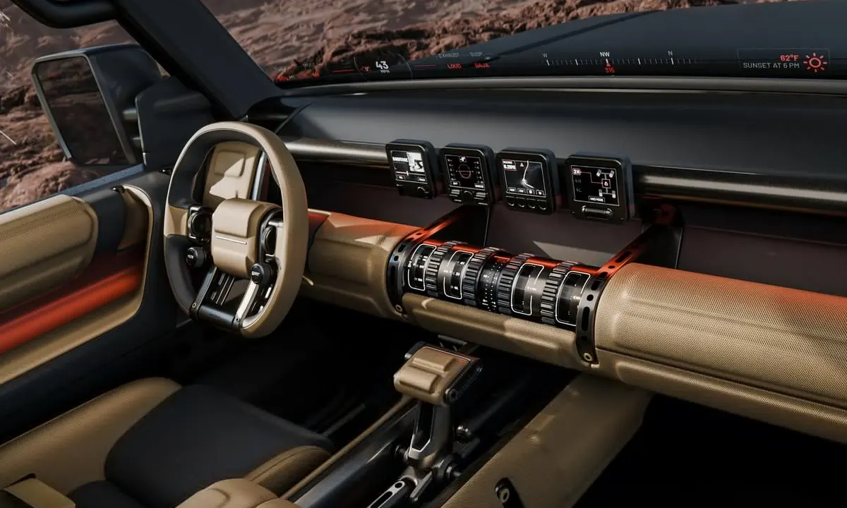 The Boulder Concept’s cabin represents one of the most philosophically coherent interior design statements to emerge from a major manufacturer’s concept programme in recent years, because it makes a deliberate and fully justified argument against the touchscreen-dominant interior philosophy that has spread through the automotive industry with the enthusiasm of a design trend rather than the caution of an engineering decision. The concept’s instrument presentation places vital vehicle information at the base of the windscreen in the form of a full-width head-up display — projecting speed, navigation and vehicle status data where the driver’s eyes naturally rest during forward motion rather than requiring a downward glance to a centre stack display. Four small square individual screens replace the single massive touchscreen that has become the automotive industry’s default infotainment approach, and each screen is accompanied by physical controls whose tactile operation — knobs and buttons that respond to gloved hands, wet hands and hands shaking with the vibration of serious off-road terrain — represents a genuine usability advantage over the capacitive touchscreen controls that require clean, dry fingertips and visual confirmation of correct operation.