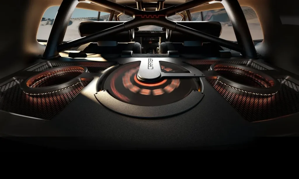 The Crater Concept’s modular platform allows integration of hub motors or dual-motor all-wheel-drive systems, delivering instant torque and precise control on varied terrains. Adaptive torque distribution, terrain scanning and active suspension enable the vehicle to adjust to surface irregularities, enhancing safety and comfort.