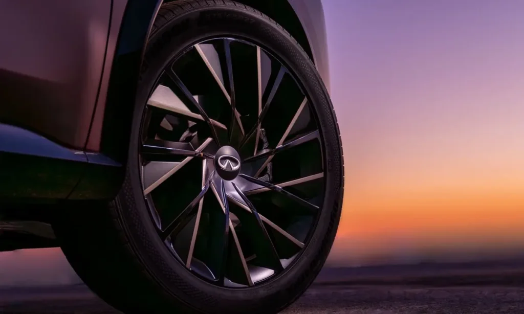 Aerodynamics are central to the QX65 Monograph Concept’s design. Its sweeping roofline, tapered glasshouse and sculpted surfaces work together to minimize drag while enhancing high-speed stability. The airflow management around the vehicle is deliberate and functional, from the front bumper’s air-diverting edges to the rear diffuser and spoiler. The wheel designs themselves likely incorporate aerodynamic improvements that reduce turbulence around the wheel arches.