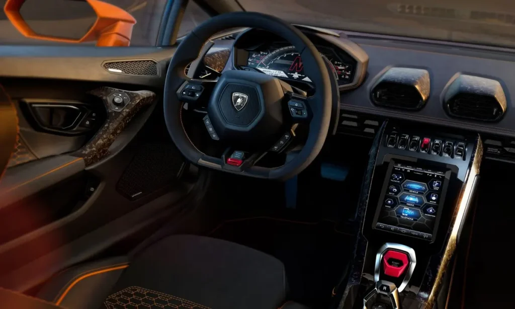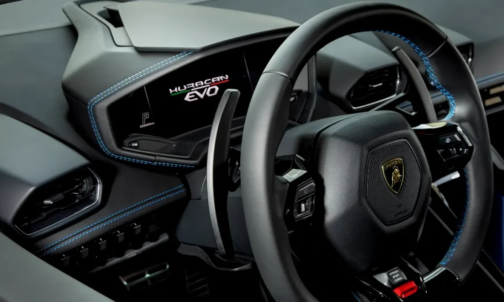 Inside the Lamborghini Huracán Evo, the evolution continues with a redesigned digital cockpit that reflects the brand’s push toward modern performance interfaces. A vertically oriented 8.4-inch touchscreen sits at the center of the dashboard, integrating climate control, navigation, vehicle performance settings and entertainment functions into one streamlined interface. The system is intuitive, responsive and compatible with both Apple CarPlay and advanced Lamborghini telemetry systems.