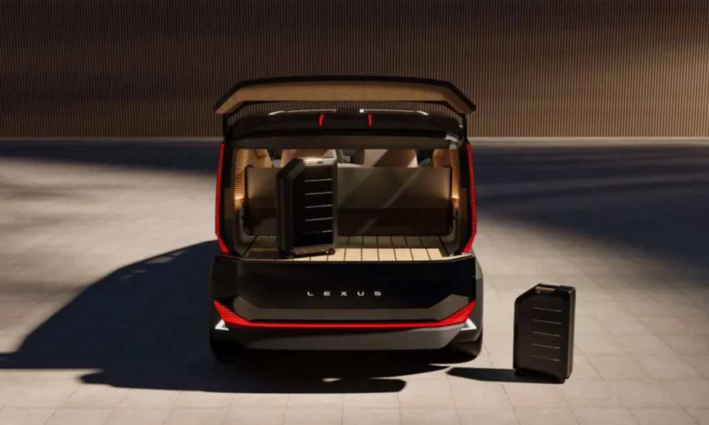 The sliding side doors open to reveal a lounge-like interior, and the vast glass roof floods the cabin with natural light, giving passengers a sense of openness and tranquility. At the rear, a seamless LED light bar stretches across the width, symbolizing continuity between Lexus’s past and future design directions.