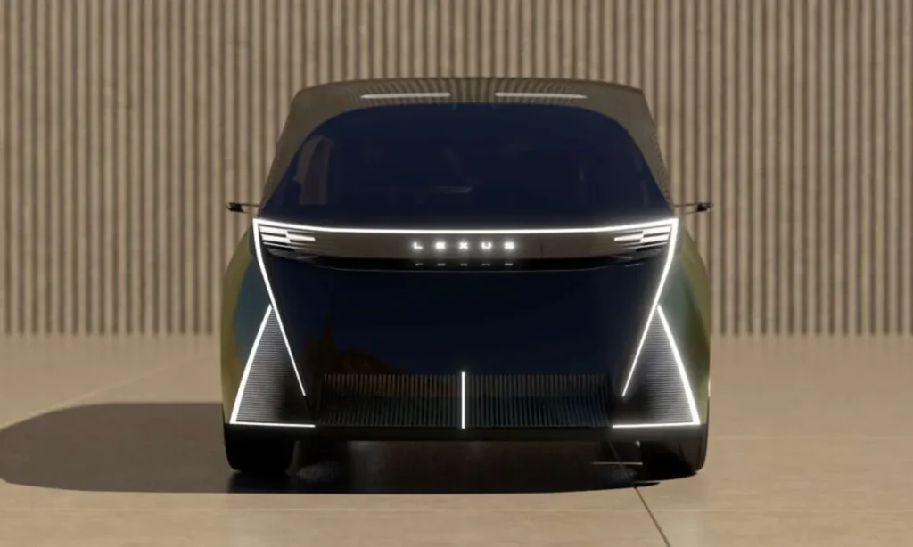 The vehicle’s overall silhouette blends the upright stance of a van with the sleek proportions of a grand tourer. The front fascia features Lexus’s signature spindle grille, now reimagined as an illuminated digital panel — a clear indicator of its electric identity. The slim LED headlights, integrated into sculpted air channels, lend the van an assertive yet graceful face.