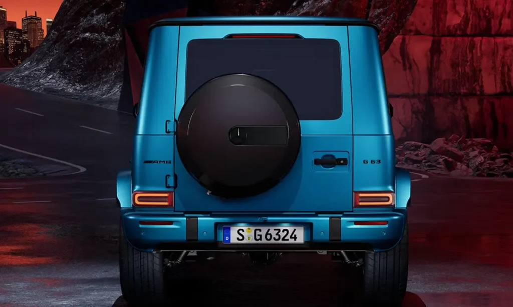 At the rear, the signature side-mounted spare wheel, upright design and squared lighting elements remain intact. The refresh introduces sleeker LED taillights and subtle contours to modernize the classic form. Overall, the Mercedes-AMG G63 blends heritage and luxury with unmistakable charisma, presenting a timeless appearance enhanced by contemporary precision.