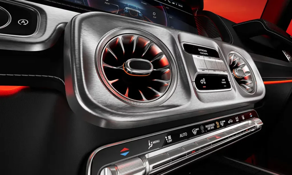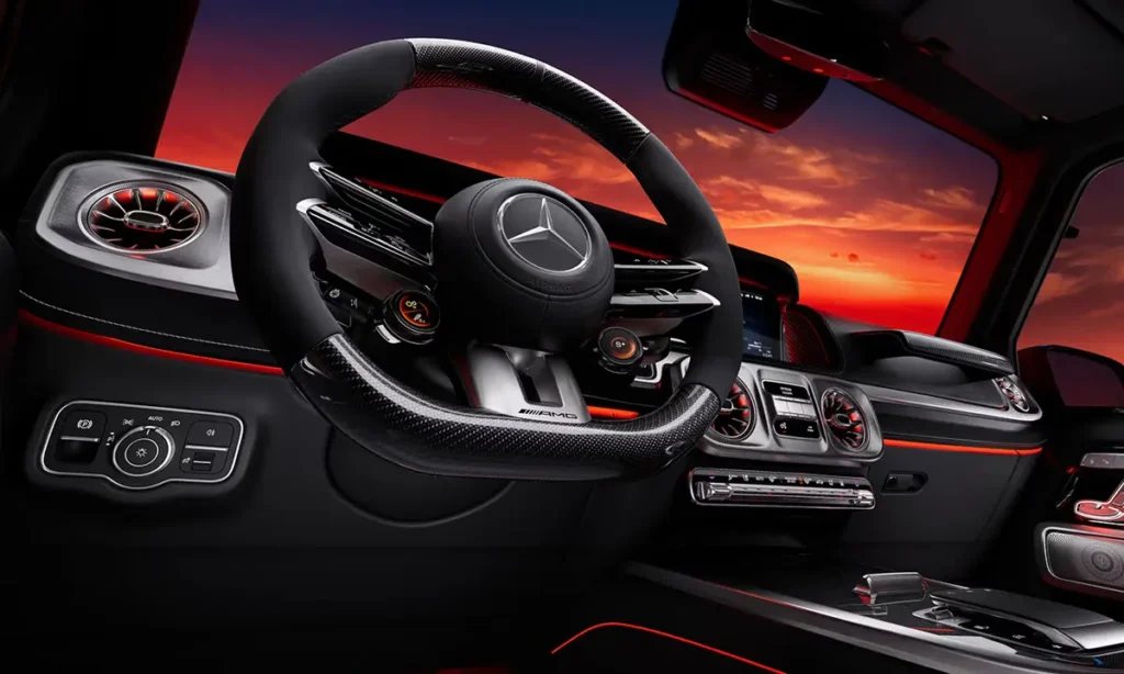 Inside the Mercedes-AMG G63, the cabin blends luxurious materials, advanced technology and rugged design cues, creating a sanctuary that balances opulence with purpose. The interior features handcrafted leather upholstery, carbon-fiber or wood trim options, and metal-textured switchgear that communicates premium quality. Even the door handles, grab bars and buttons carry a sense of permanence and durability befitting the G-Class legacy.