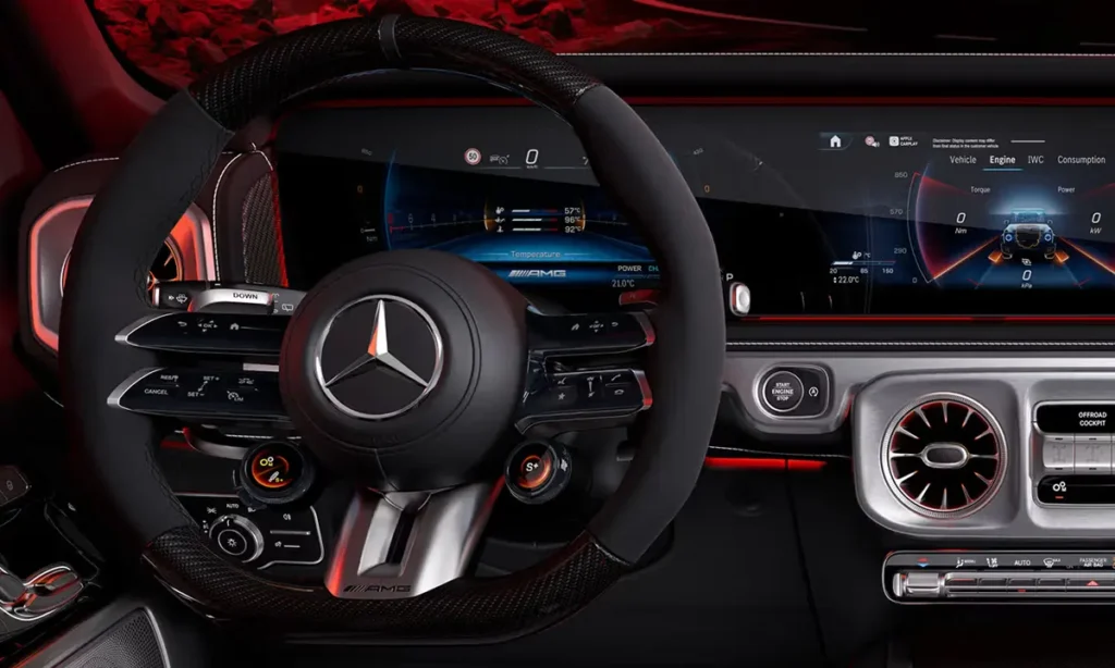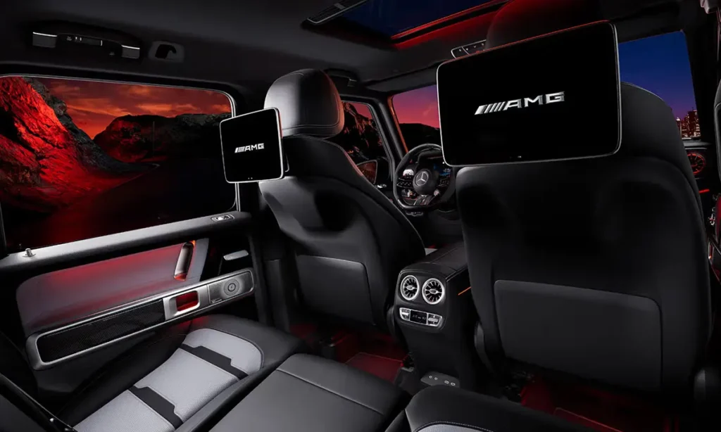 The dual-screen widescreen cockpit integrates a digital instrument cluster and infotainment display, using Mercedes’ MBUX system for intuitive control. The interface supports voice commands, customizable themes, augmented reality navigation and seamless smartphone integration. The G63’s instrument cluster includes AMG-specific menus that display boost pressure, lap timers, engine data and performance metrics.