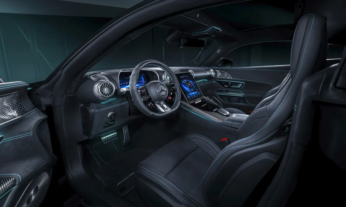 The standard AMG Exterior Carbon Fibre Package — fitted as standard on the GT 63 PRO rather than offered as an optional extra — brings a front splitter, side sill trim strips, rear diffuser and the fixed rear wing all finished in high-quality visible carbon fibre. The fixed rear wing, which contributes approximately 33 pounds of additional rear axle downforce, works in carefully calibrated aerodynamic harmony with every other element of the PRO’s aero package, ensuring that the downforce balance front to rear is precisely managed rather than simply maximised at the rear at the expense of front stability. The active carbon fibre underbody fairing, which lowers the entire underbody by 1.6 inches at speeds above 50 mph, completes an aerodynamic package that AMG’s own aerodynamic and dynamics engineering teams developed in genuine close collaboration — ensuring that every element was tuned with full knowledge of what every other element was doing. The result is a coupe that is as aerodynamically sophisticated as anything available in the grand touring segment, regardless of price.