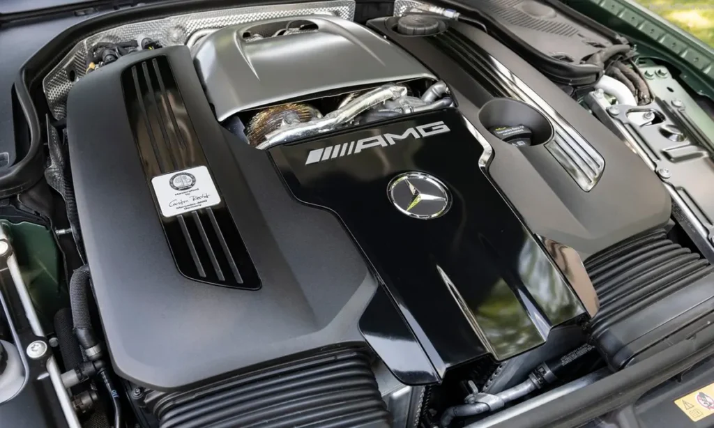 At the core of the SL 63 4MATIC+ lies the legendary AMG 4.0-liter twin-turbocharged V8 — hand-built in Affalterbach under AMG’s “One Man, One Engine” philosophy. Each engine is meticulously assembled by a single technician, whose name is engraved on a plaque atop the powerplant.