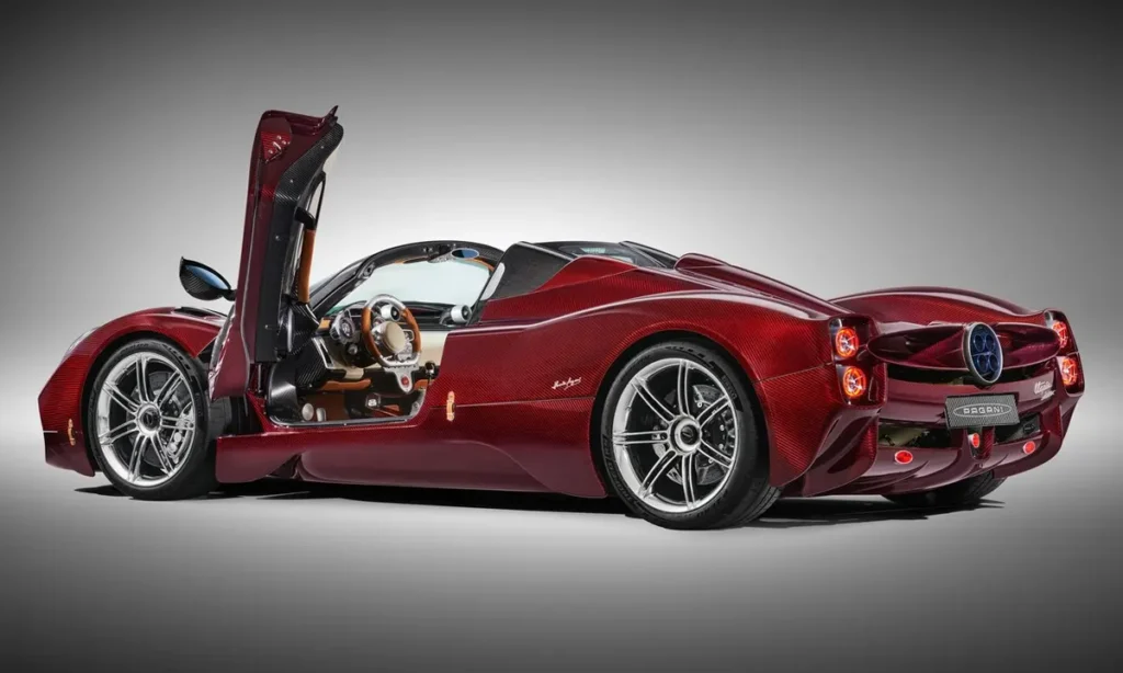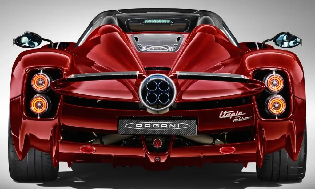 The Roadster’s roof system is crafted from ultra-light composite materials, allowing owners to remove it by hand and store it in a dedicated compartment. Once removed, the vehicle transforms completely: the cockpit becomes an immersive open-air environment, and the engine’s acoustics become a central part of the experience. The rear portion of the car is arguably its most dramatic element, featuring quad exhaust pipes arranged in Pagani’s signature diamond pattern, surrounded by exposed carbon structures and flowing aerodynamic fins.