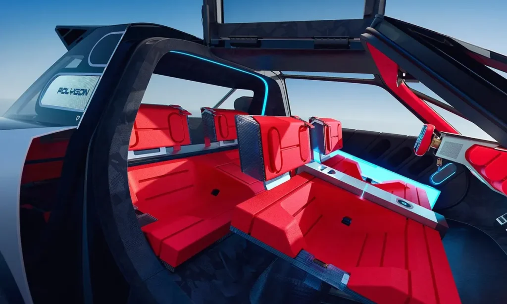 Seating is crafted from sustainable materials including bio-sourced textiles, recycled microfibers and plant-based polymer composites. The seats feature a floating polygonal frame that provides a lightweight yet supportive structure, enhancing comfort for long journeys. Ambient lighting integrated within the seat structures and interior panels creates a multi-dimensional effect that changes tone and intensity based on driving mode or user preference.
